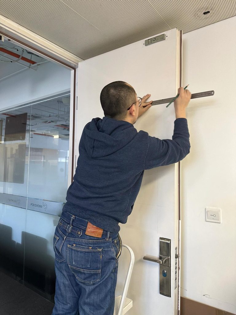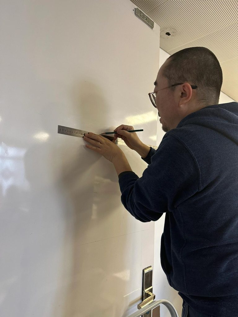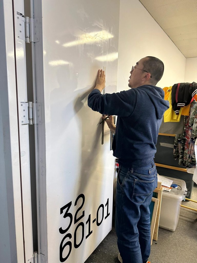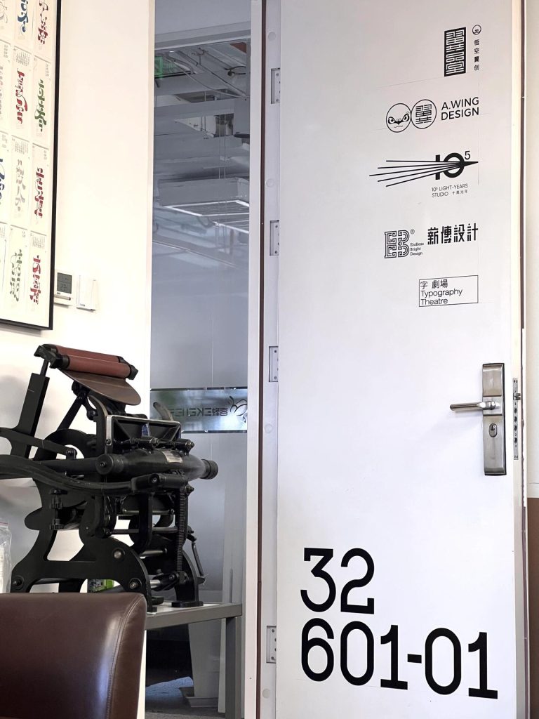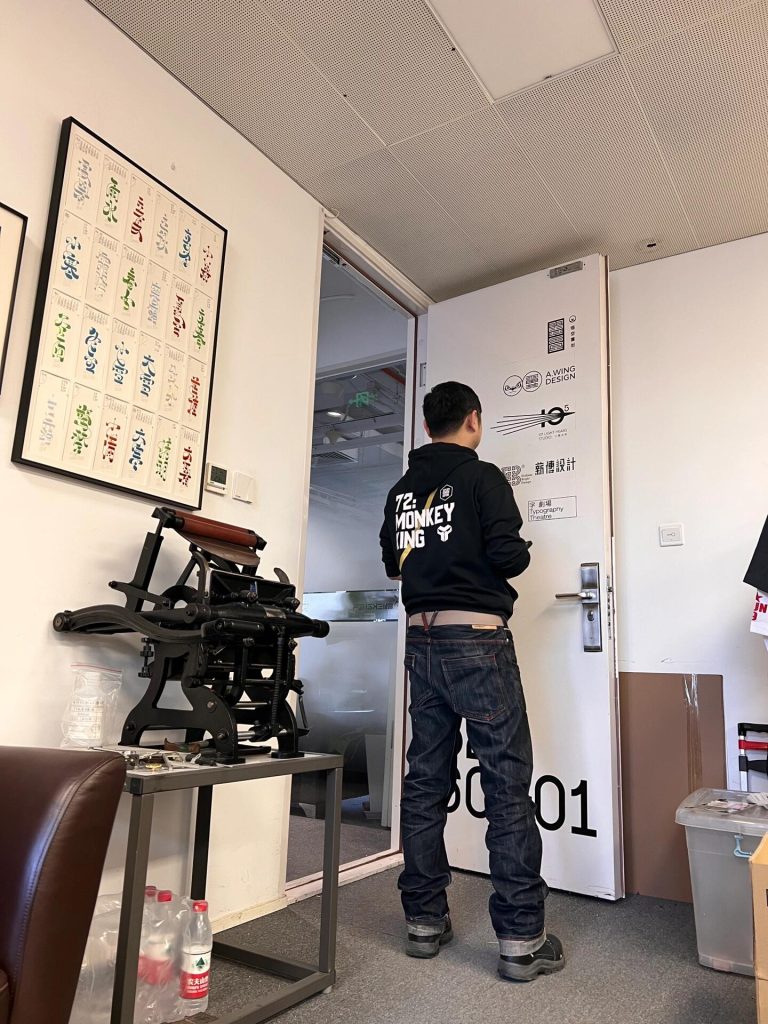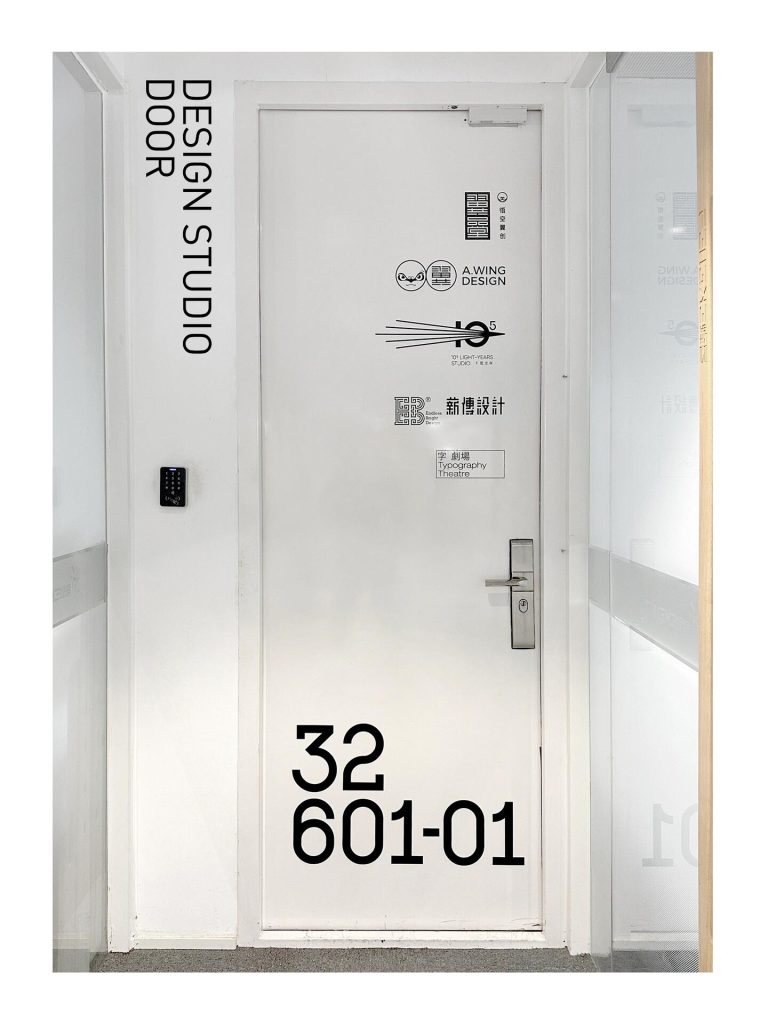 The office we rented has no sign, making it hard for visitors to find us. We collaborated with @liǎma to design the studio’s white door, turning our logo and text into a silkscreen panel. During the collaboration, we carefully aligned all elements according to the manual guidelines and completed all the work ourselves. The result is amazing! We added a magnetic lightbox to make the appearance better. It’s definitely the most eye-catching door in the building.